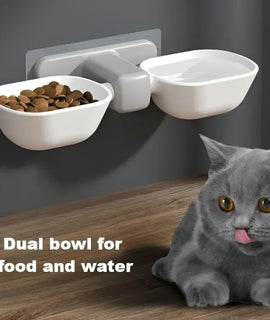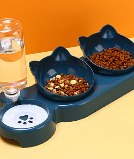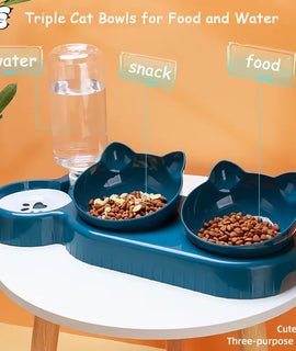 Triple Cat Bowls Pet Feeder, 2-in-1 Double Bowls with Automatic Drinking Bottle, Tilted and Rotatable Design for Cats and Dogs